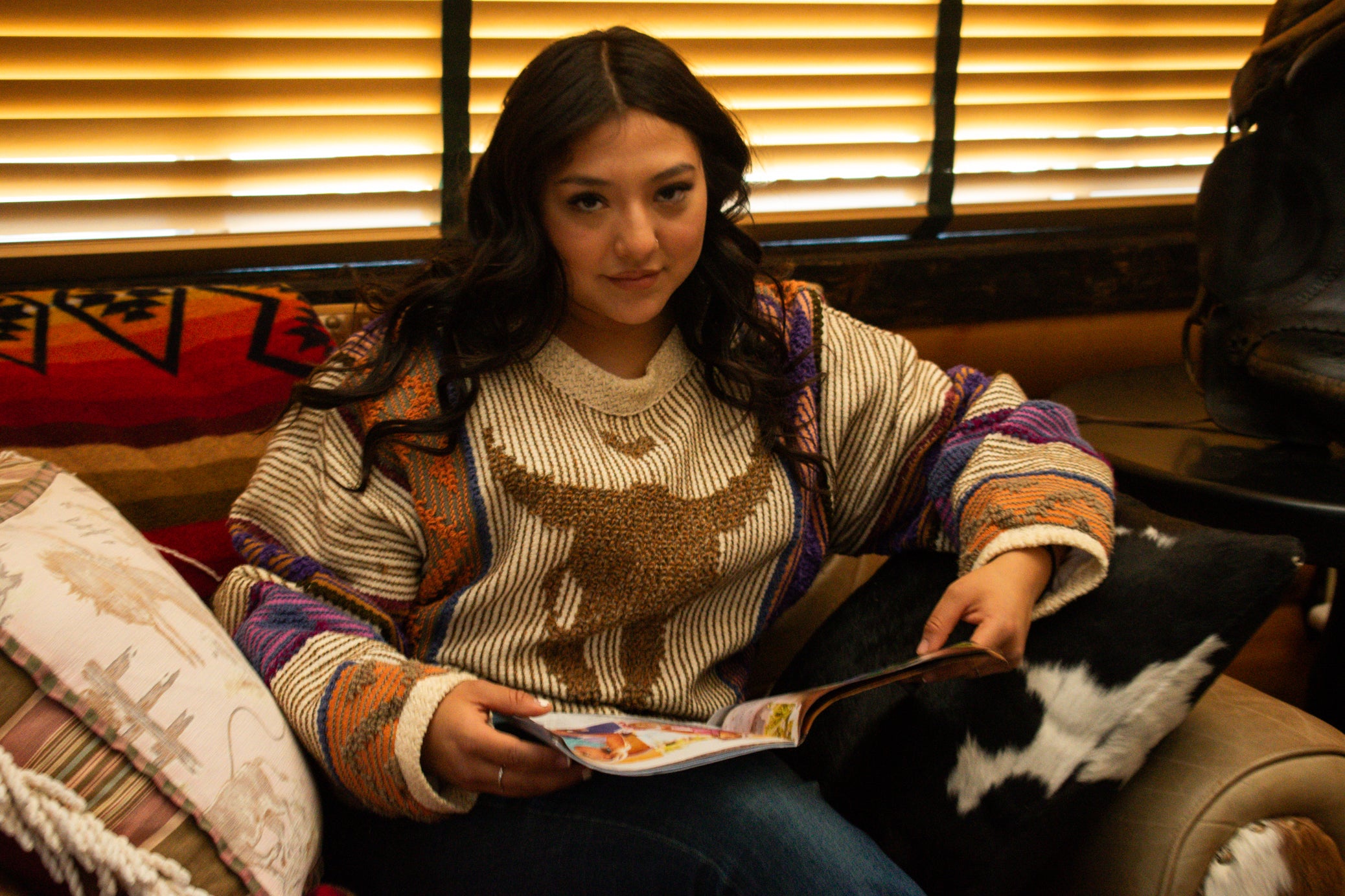 Allen Wah Collection Western tan Cow Skull Multi - Colored Pull - Over Sweater with Lining