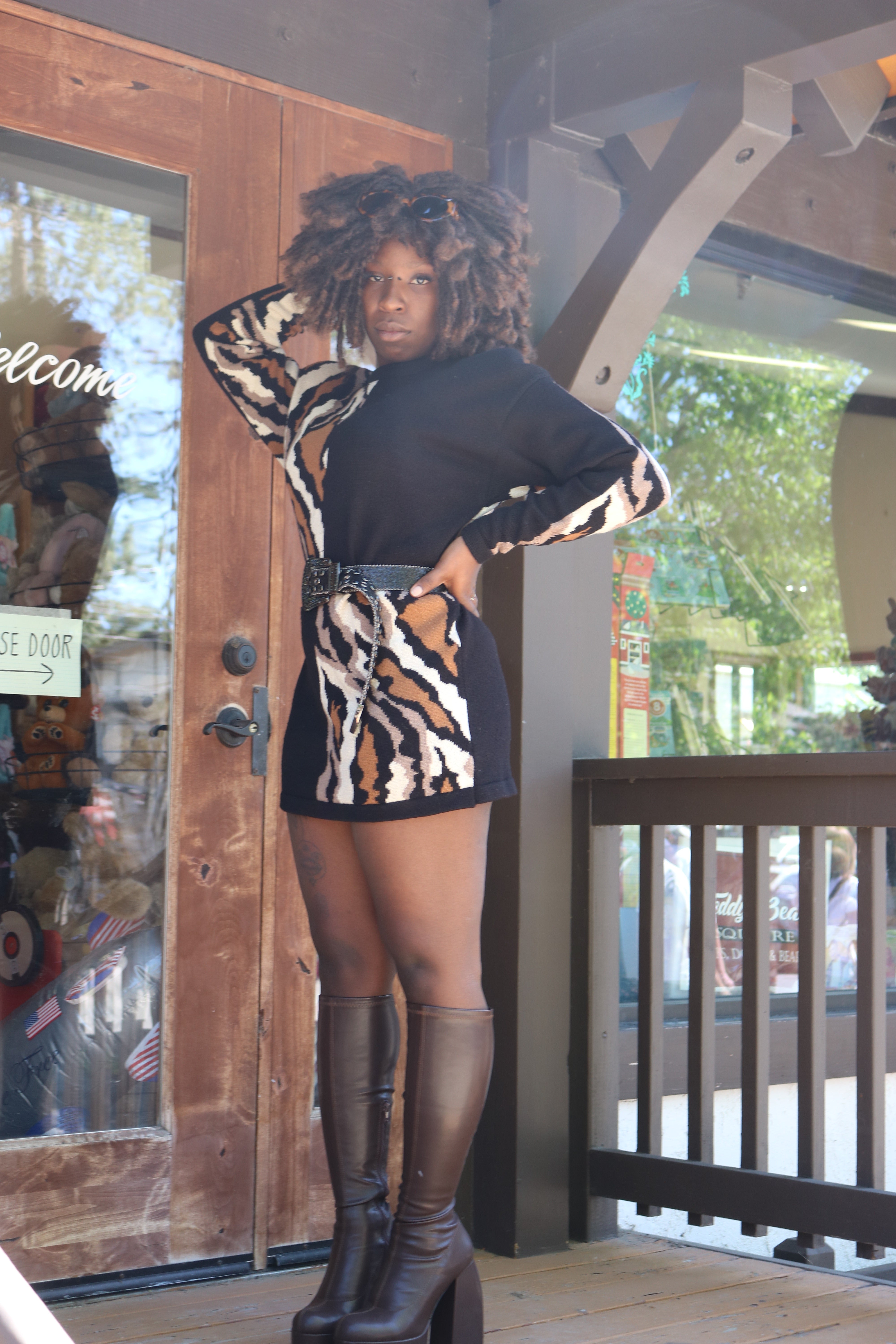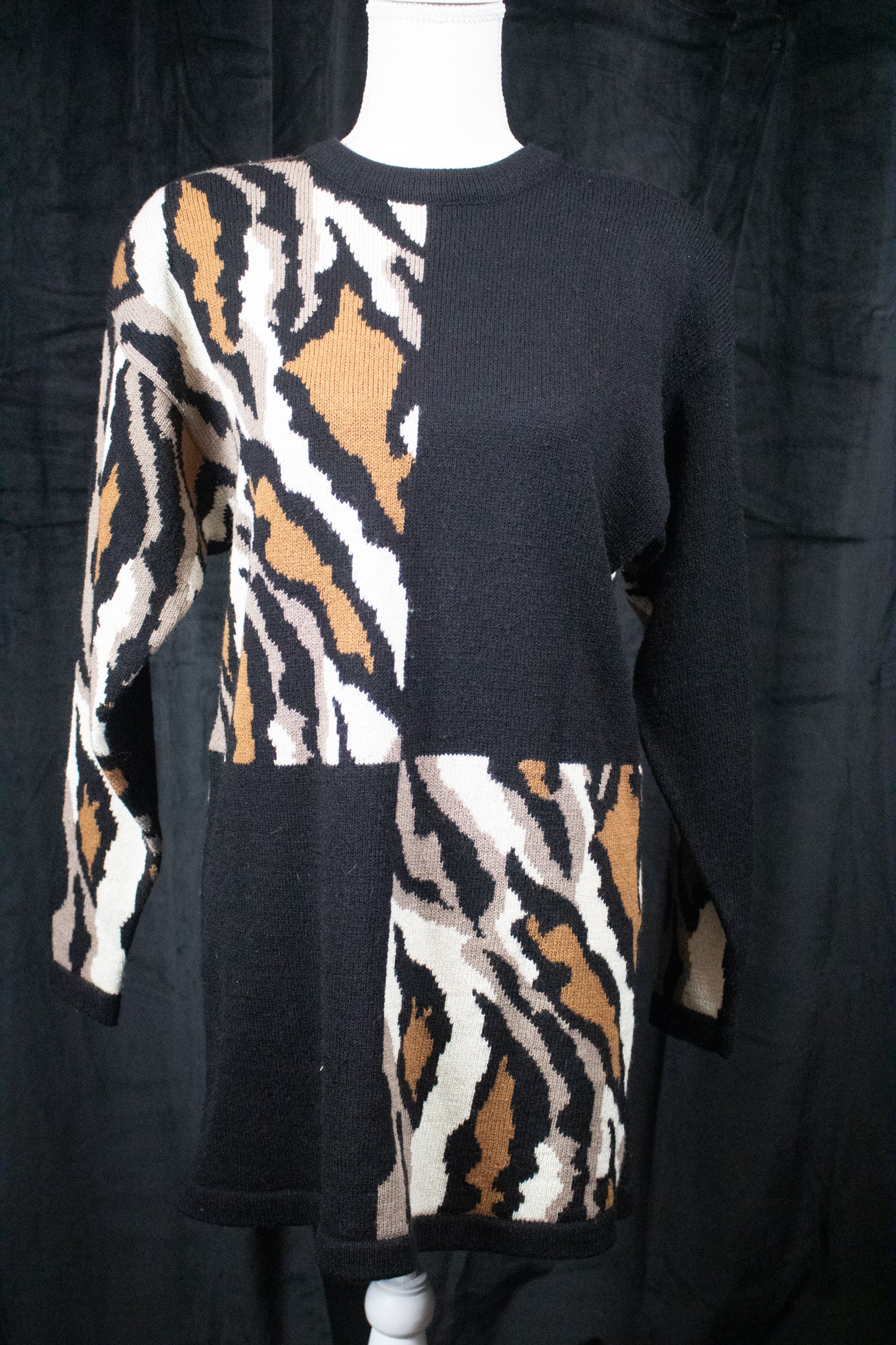 Anne Crimmins For Umi Collections Black/Brown/Tan/White Print Sweater Dress