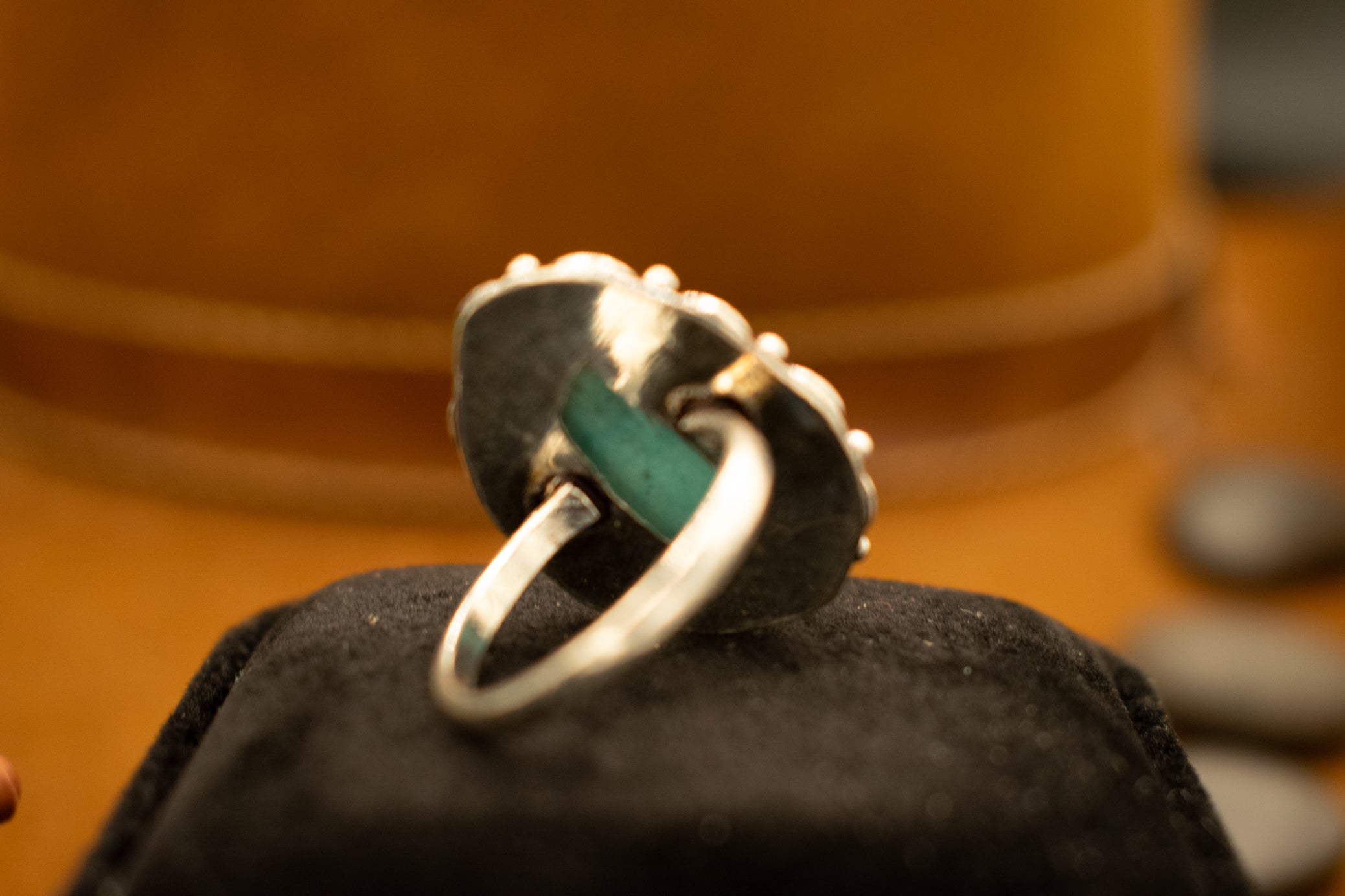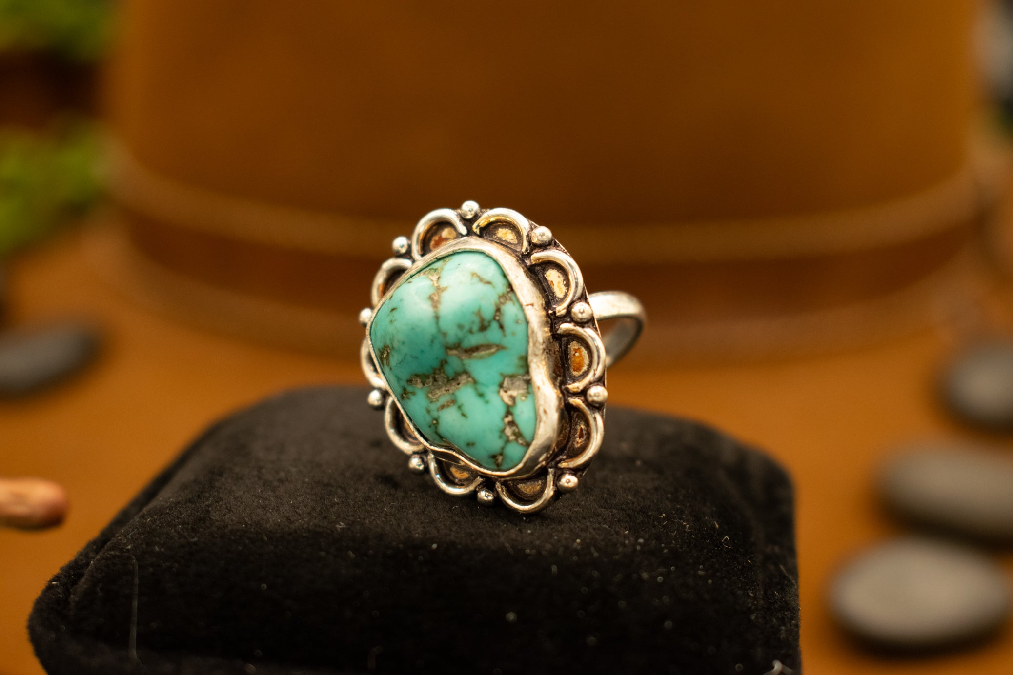 This Faux Turquoise gemstone inbeded into a metal ring with a beautifully detailed boarder. This Piece adds a touch of sophistication to your look with this luxurious and exclusive piece. This ring is an excellent gemstone statement piece. It is a bold statement and is an excellent gift idea for women. Available in size 8