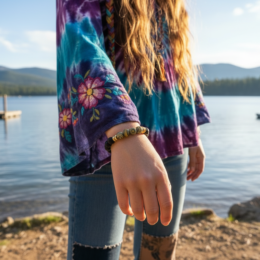 Lovely Lava Stone Beaded Stretch Bracelet Accented with Yellow and Black and White Marbled Beads and Gold-toned Spacer