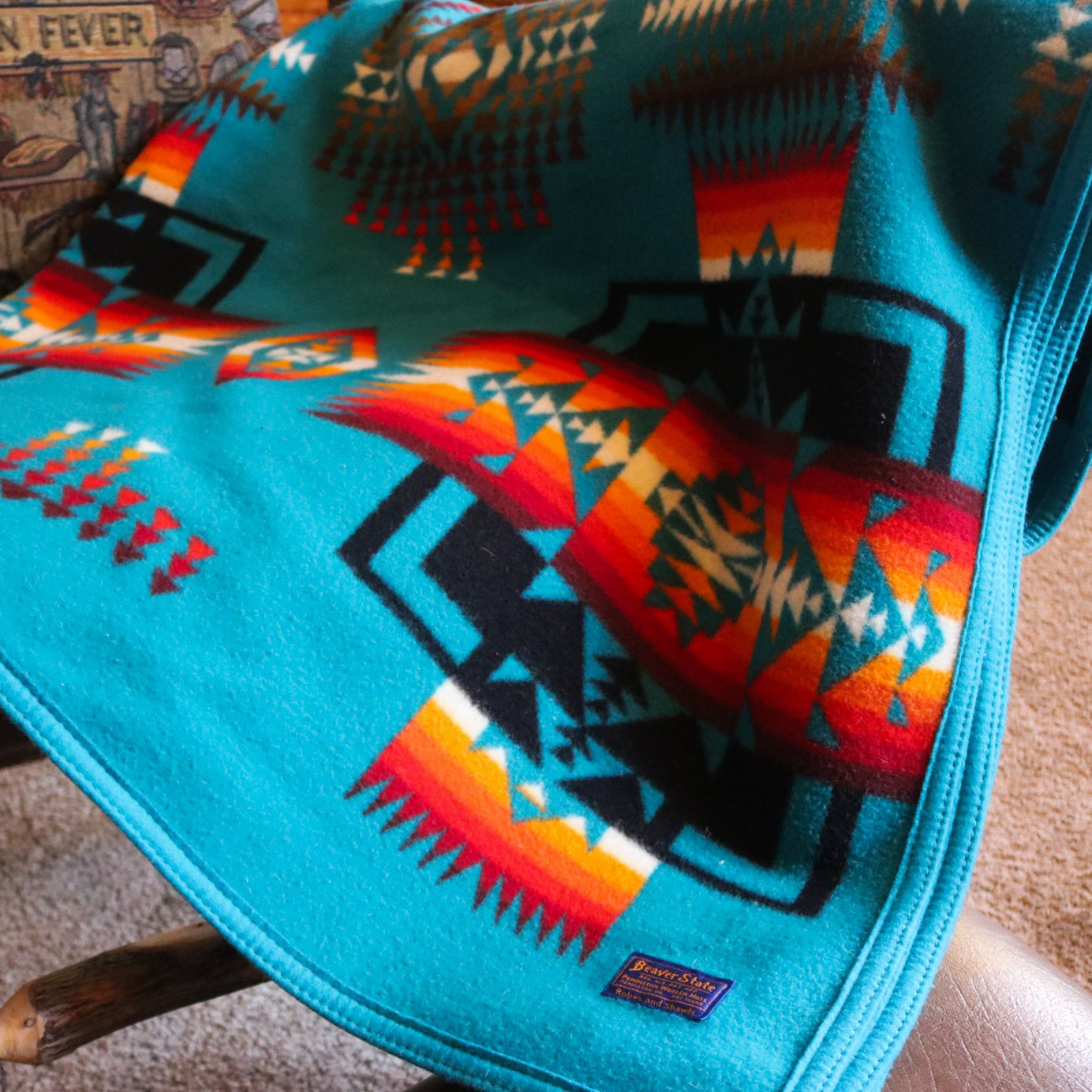 Pendleton Beaver State Blanket Featuring Bold Teal Blue with Warm Reds and Oranges
