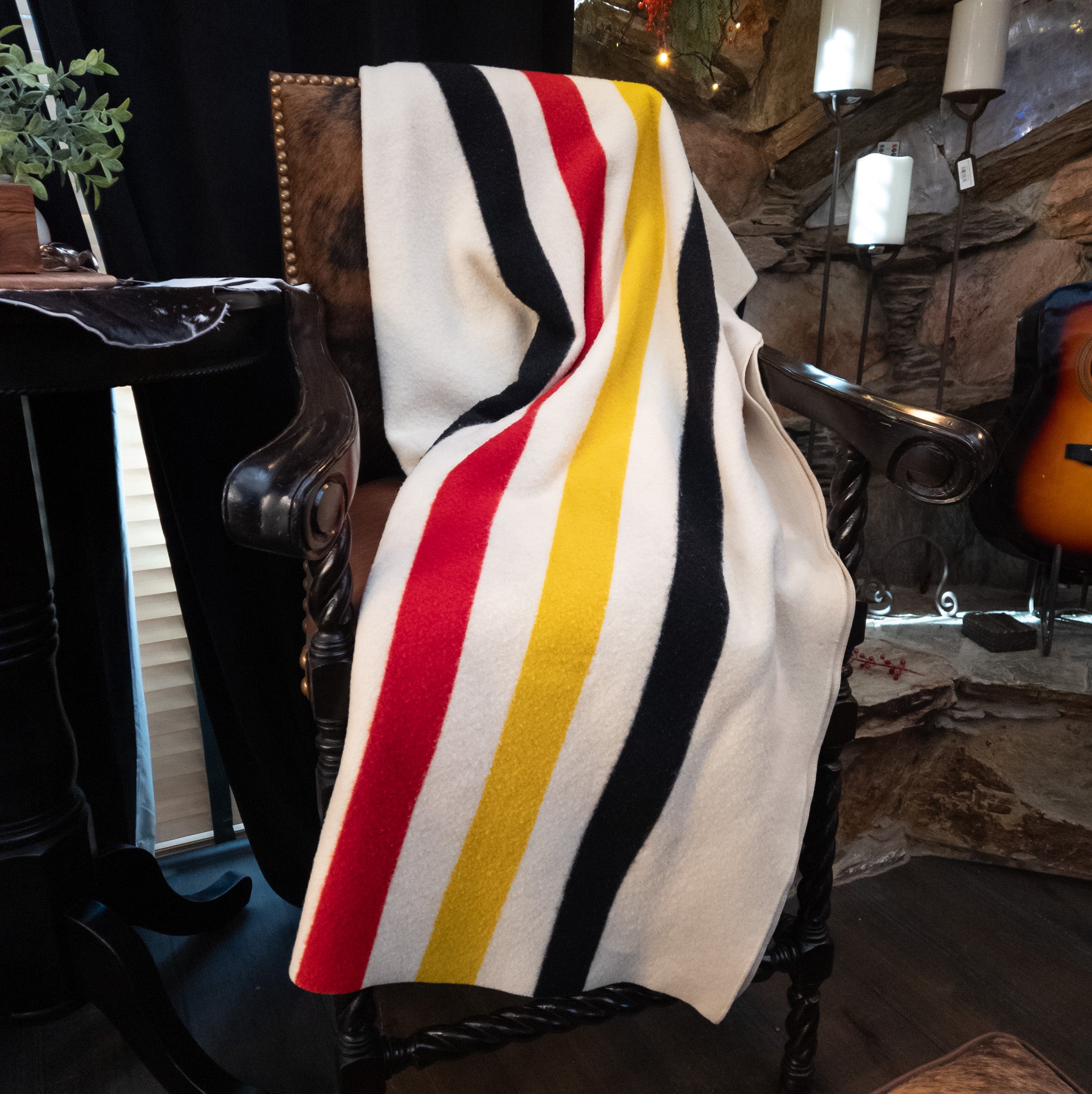 Pendleton Glacier Park Virgin Wool Blanket Cream Colored with Vibrant Black Yellow & Red Stripes