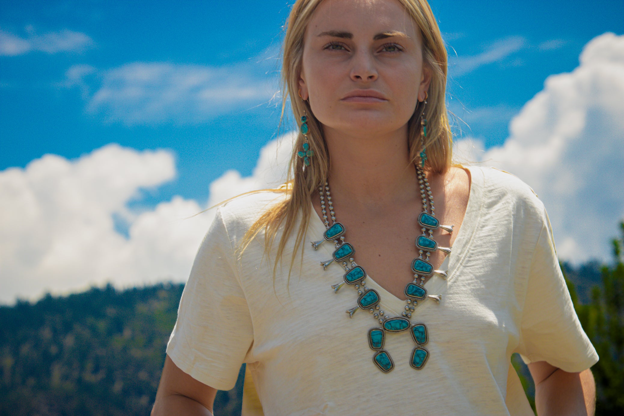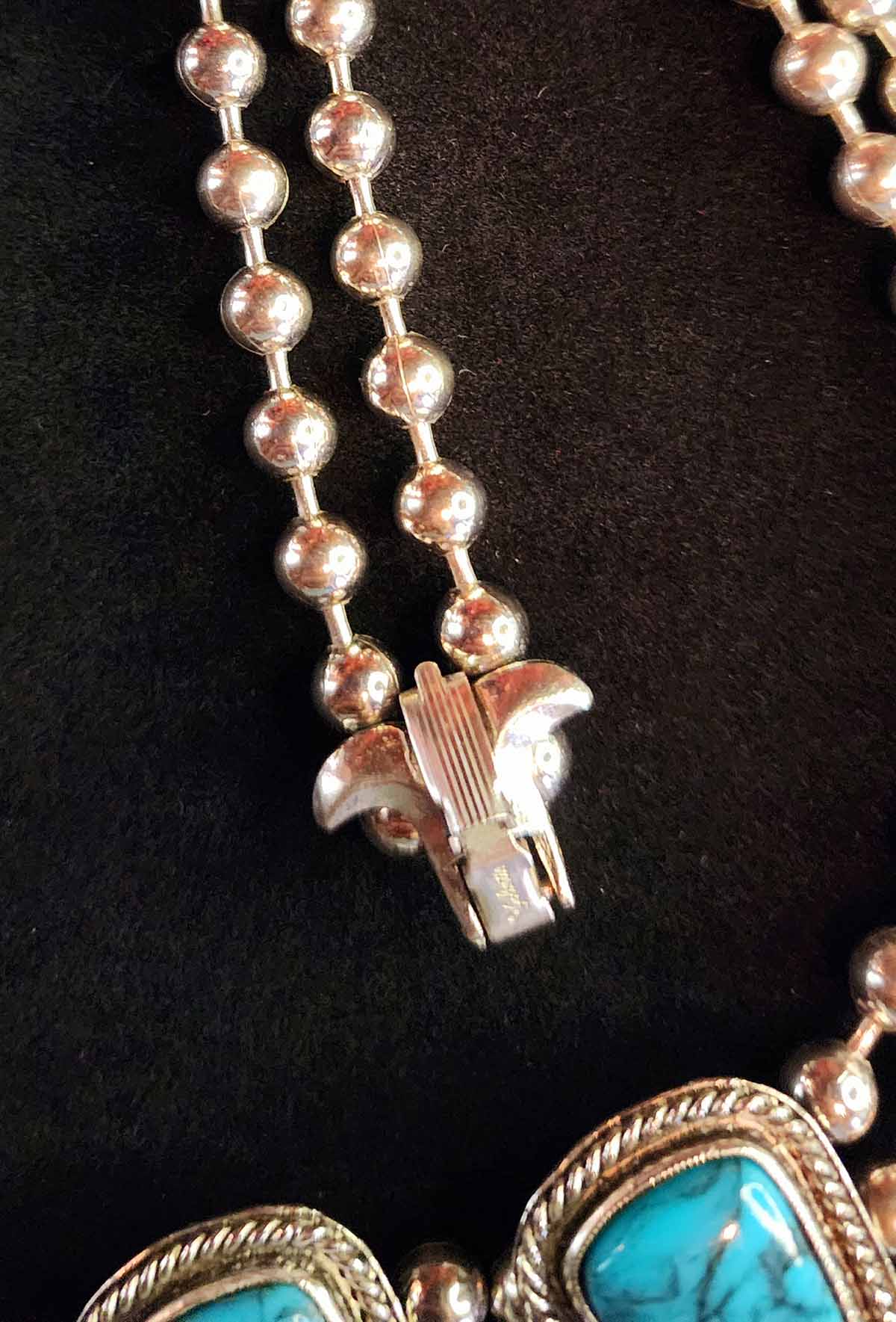 Vintage Pewter Faux Turquoise Squash Blossom Necklace